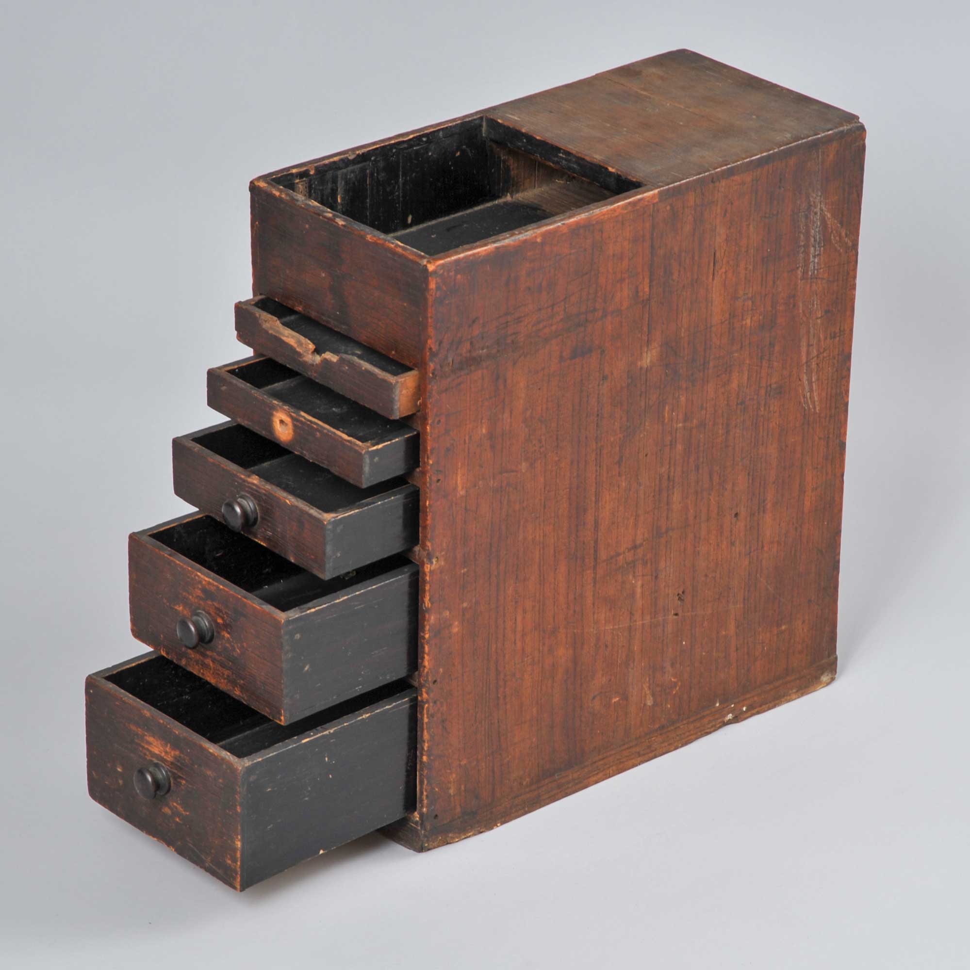- 階段状の引き出し: 髷を結う工程で使う道具(櫛、元結、油など)を種類ごとに分けて収納し、作業中に必要なものをすぐに取り出せるように工夫されています。