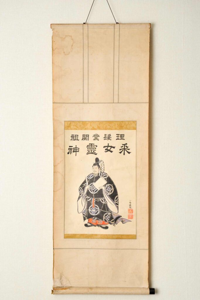 采女亮は新羅人から髪結い技術を学び、結髪所を開きましたが、店の床の間には采女亮が敬う天皇をまつる祭壇があったため、この店のことを「床の間のある店」、「床場」、「床屋」というようになり、下関から全国に広まったといわれている。