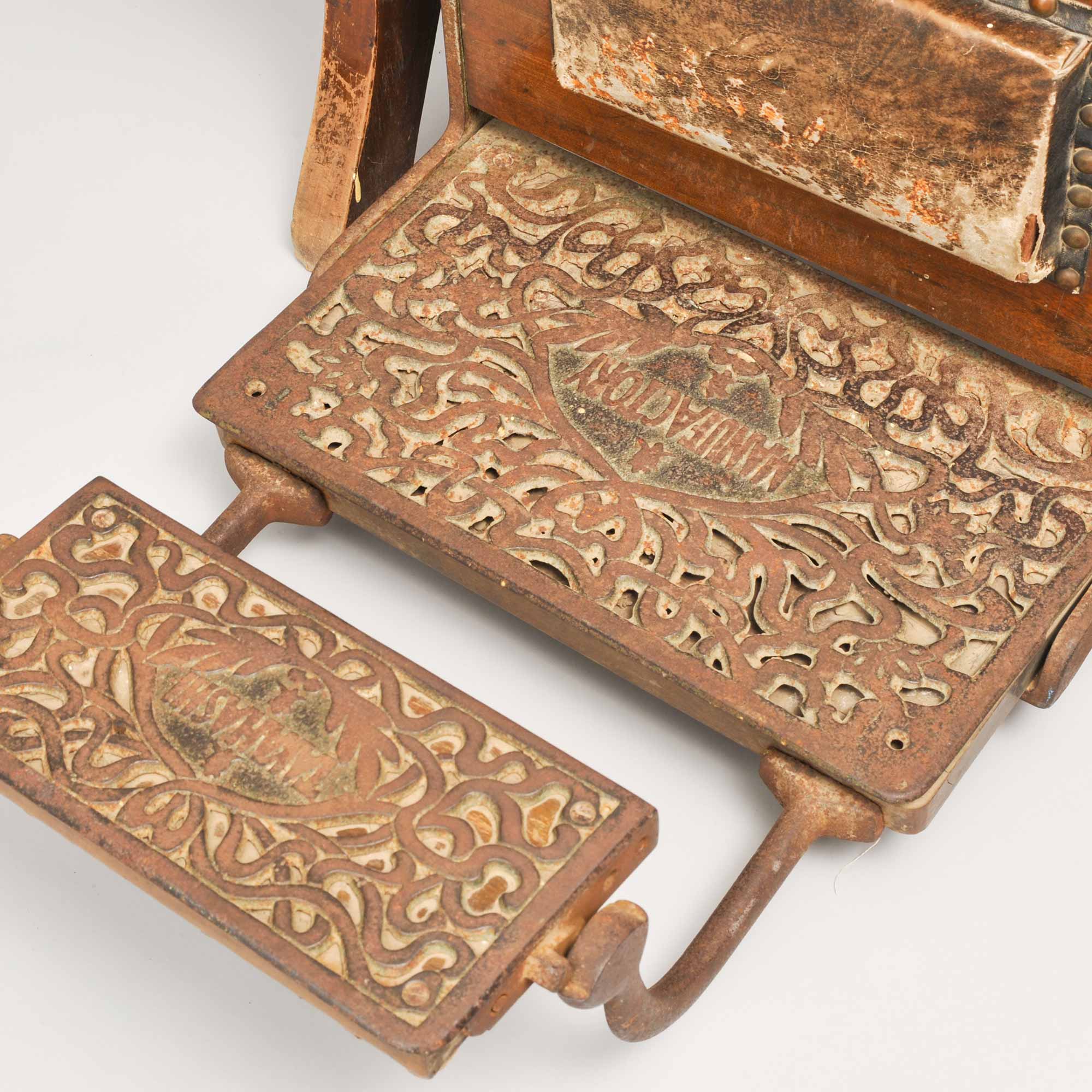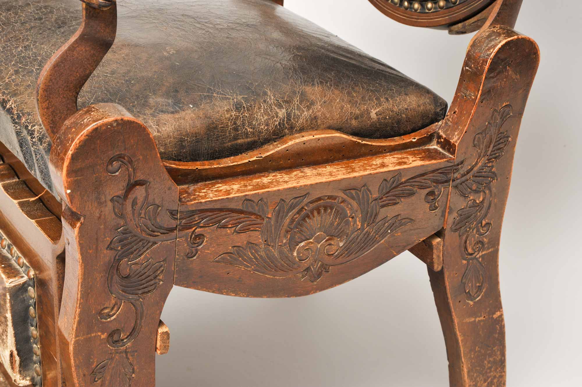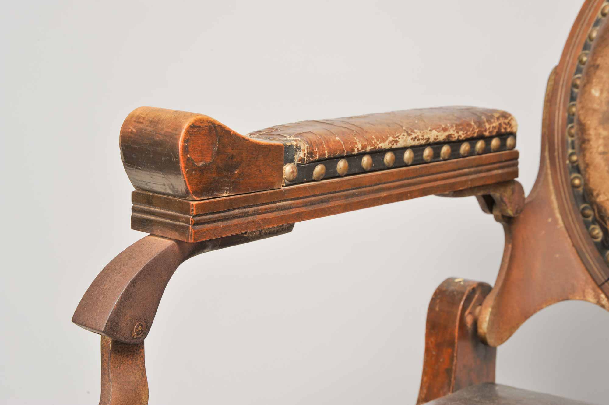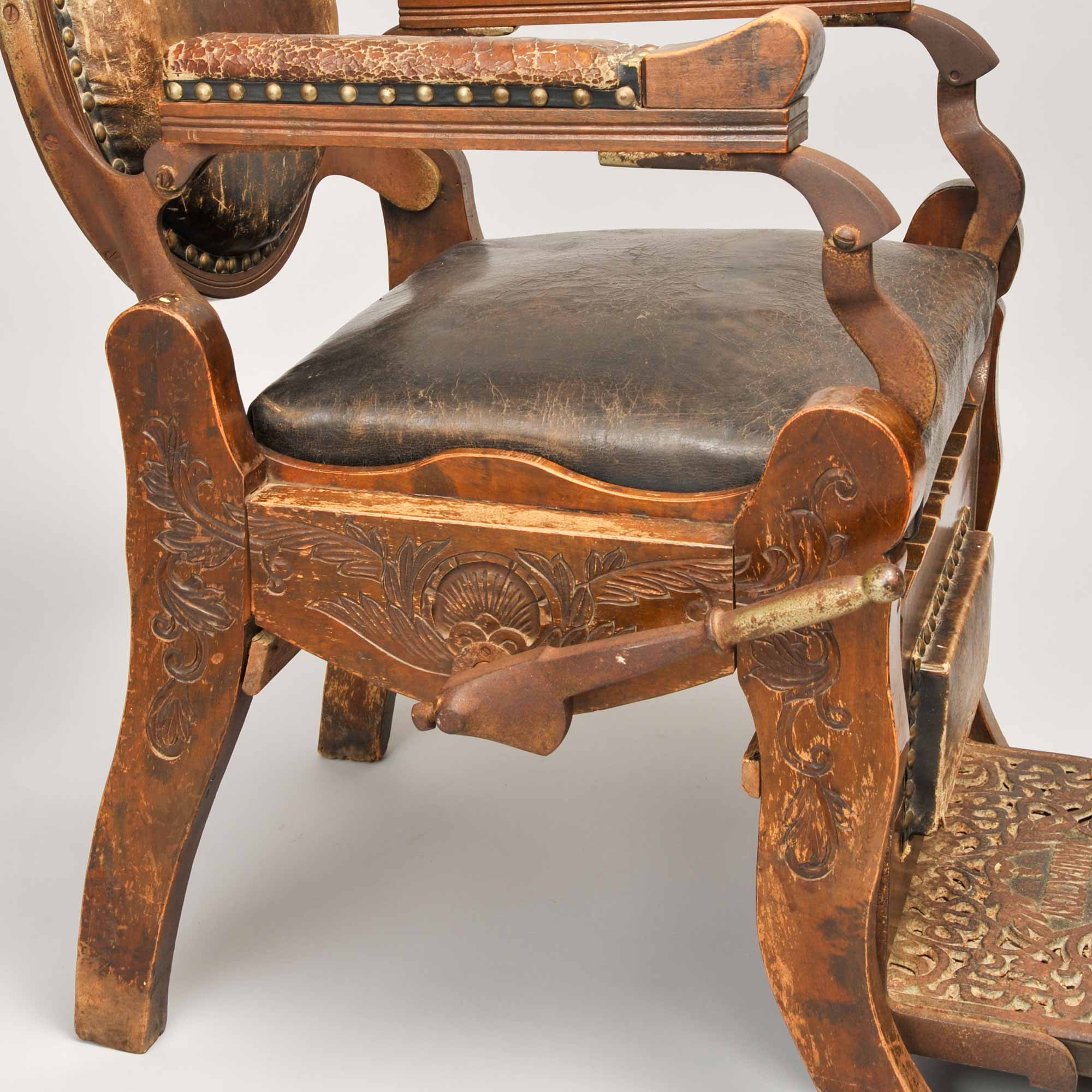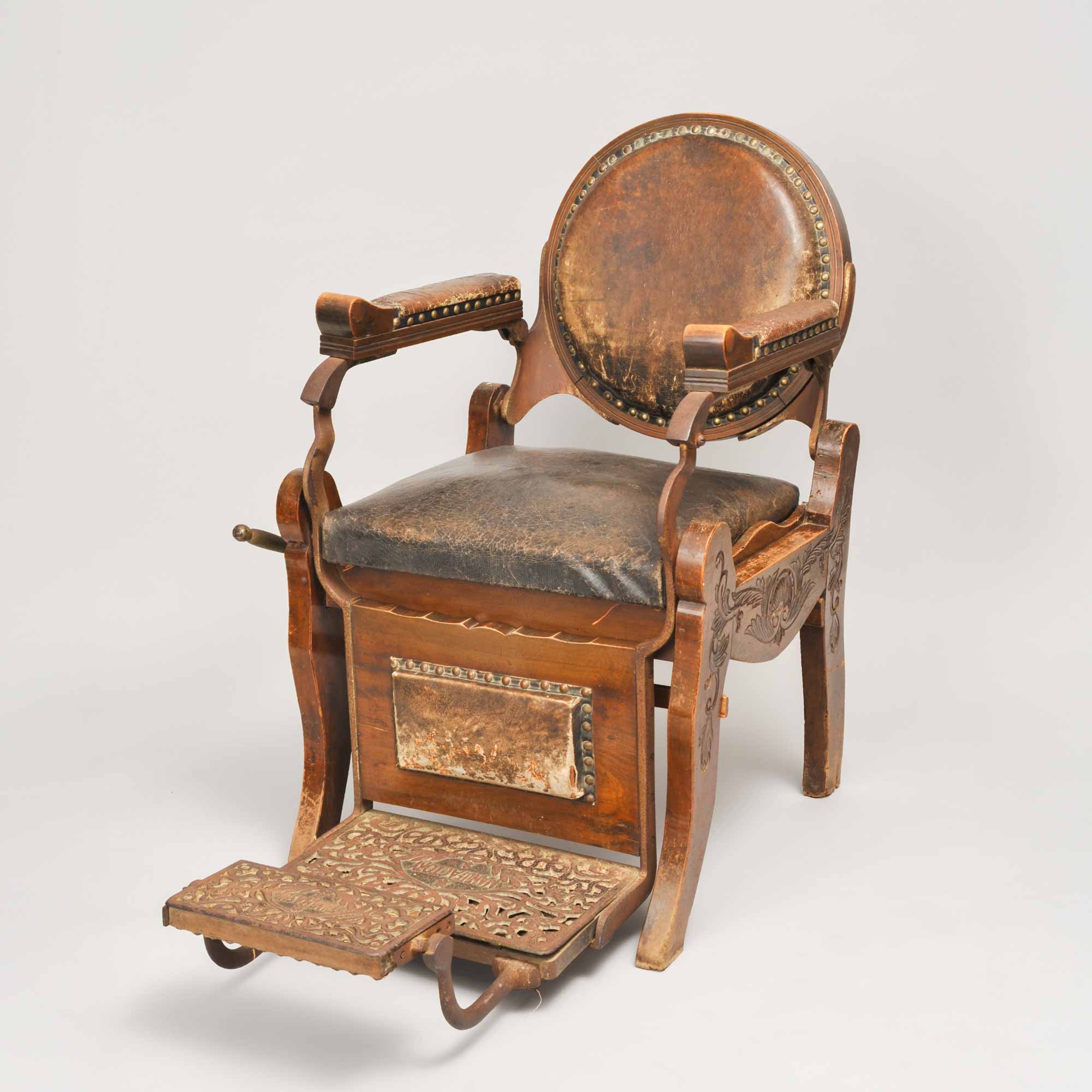 大正中期に登場した足をのせる台がついた理容椅子。椅子の右手側のハンドルを動かすと、背もたれがリクライニングする仕組みになっている。機能性は上がったものの、動くのはその部分のみ。廻転式の椅子が登場するのは昭和に入ってからとなる。