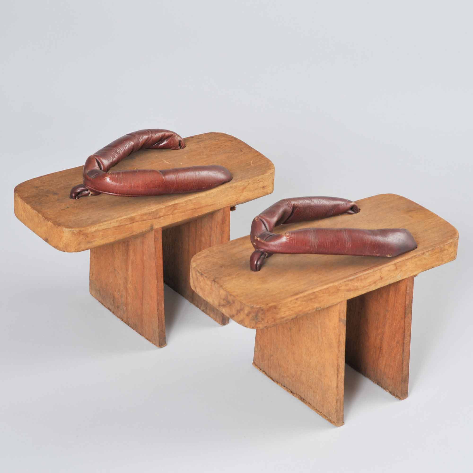 高下駄 明治30年頃の町床では、着物にたすきがけをし、下駄を履くという師弟のスタイルだった。見習いは高歯を履き、下働きの間は睡魔防止で1枚歯(眠ると倒れるため)、顔剃りのできる師弟になると二枚歯になった。