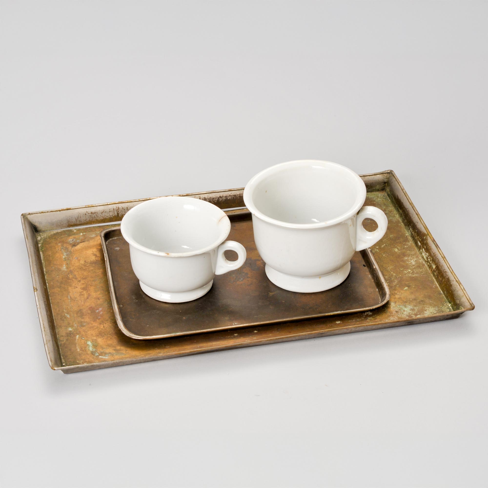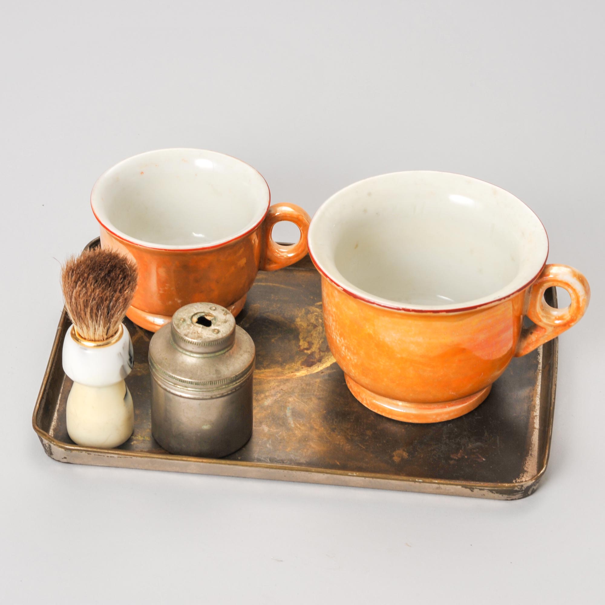 カップにお湯と粉石鹸を入れ、ブラシでかき混ぜ泡立てる現代とはほぼ変わらぬシェービングスタイル。