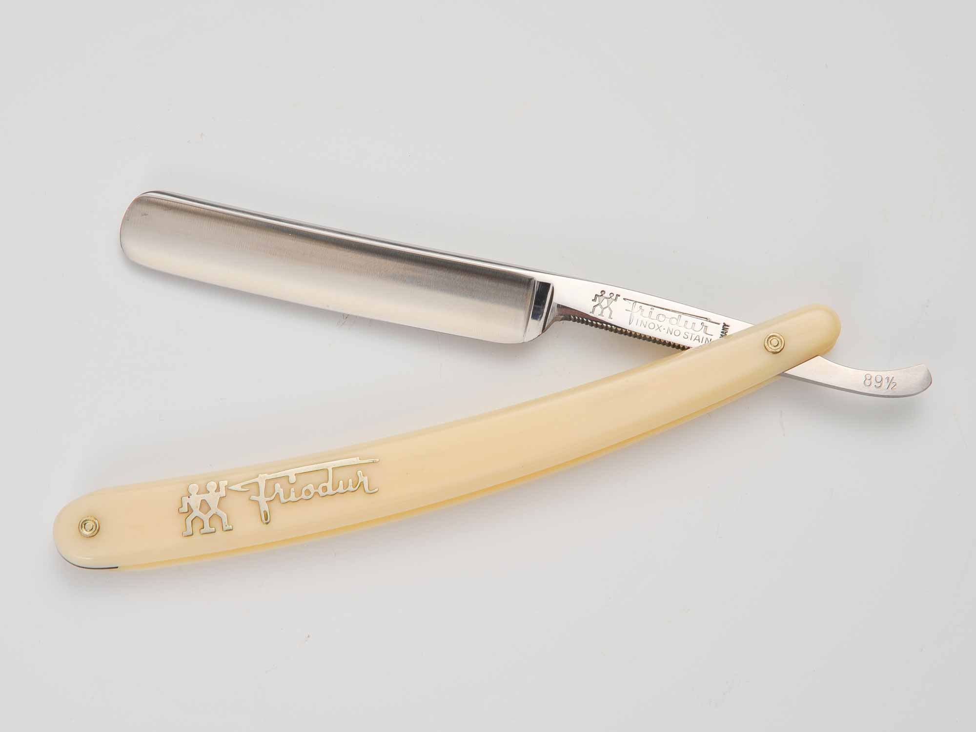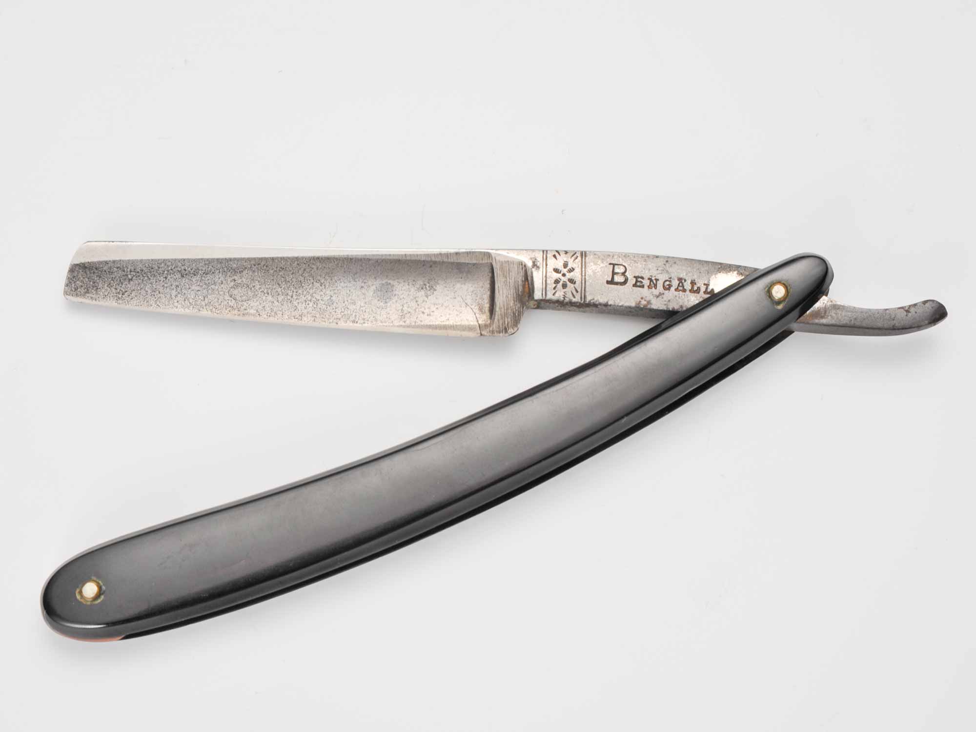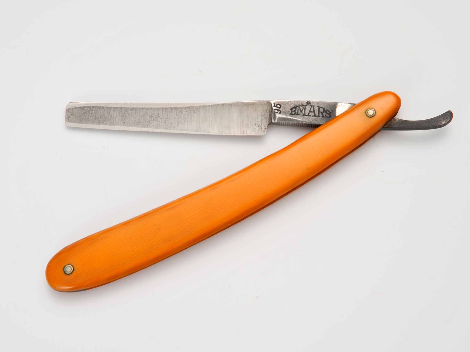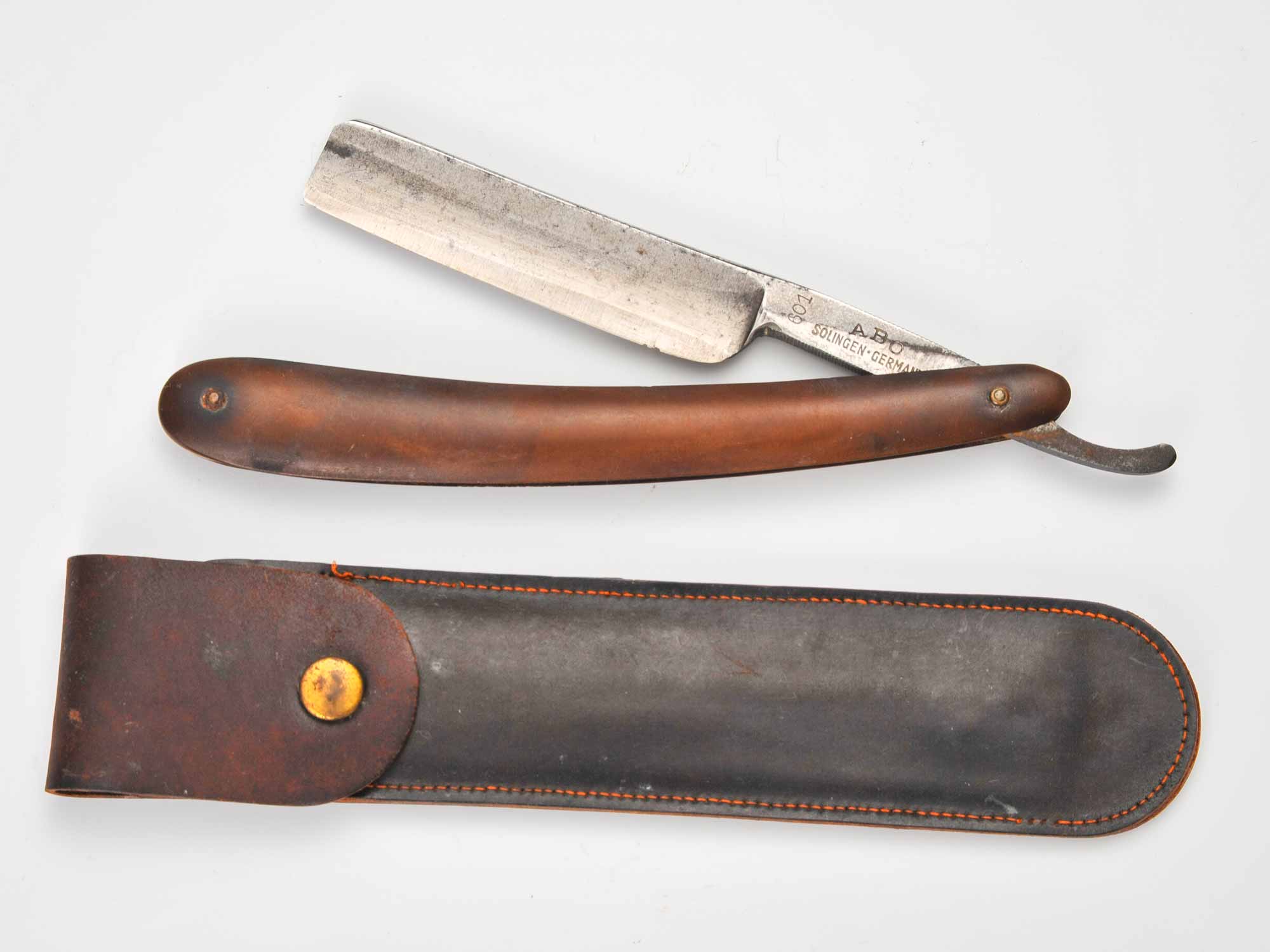 西洋剃刀のレザーは「両刃」が特徴。折り畳み式で、柄兼用の鞘がある。