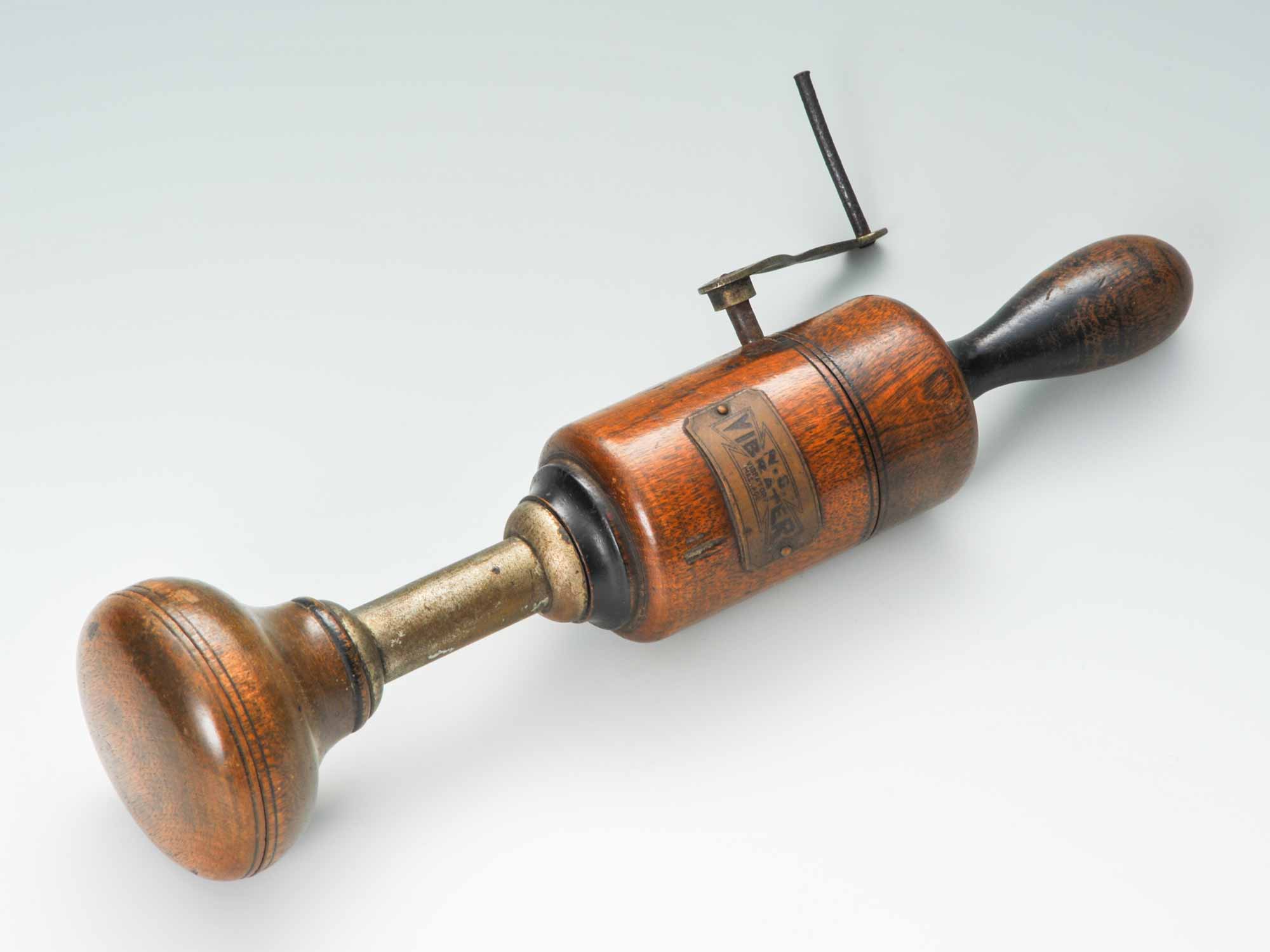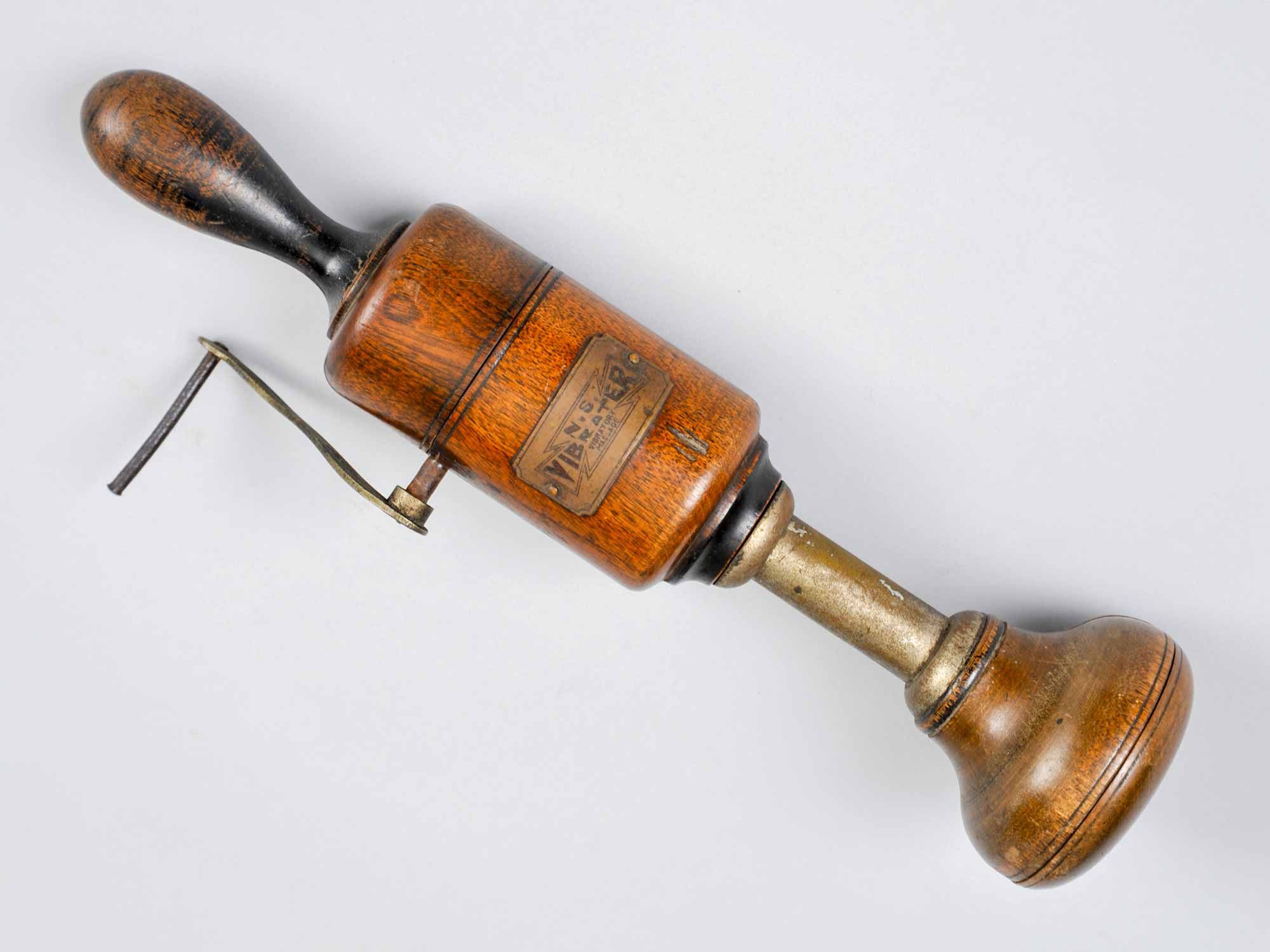 お客さまの肩をマッサージする器具。ハンドルを手で回すと先端部が振動するようになっている。いま使用しても気持ち良く、性能の高さがうかがる。