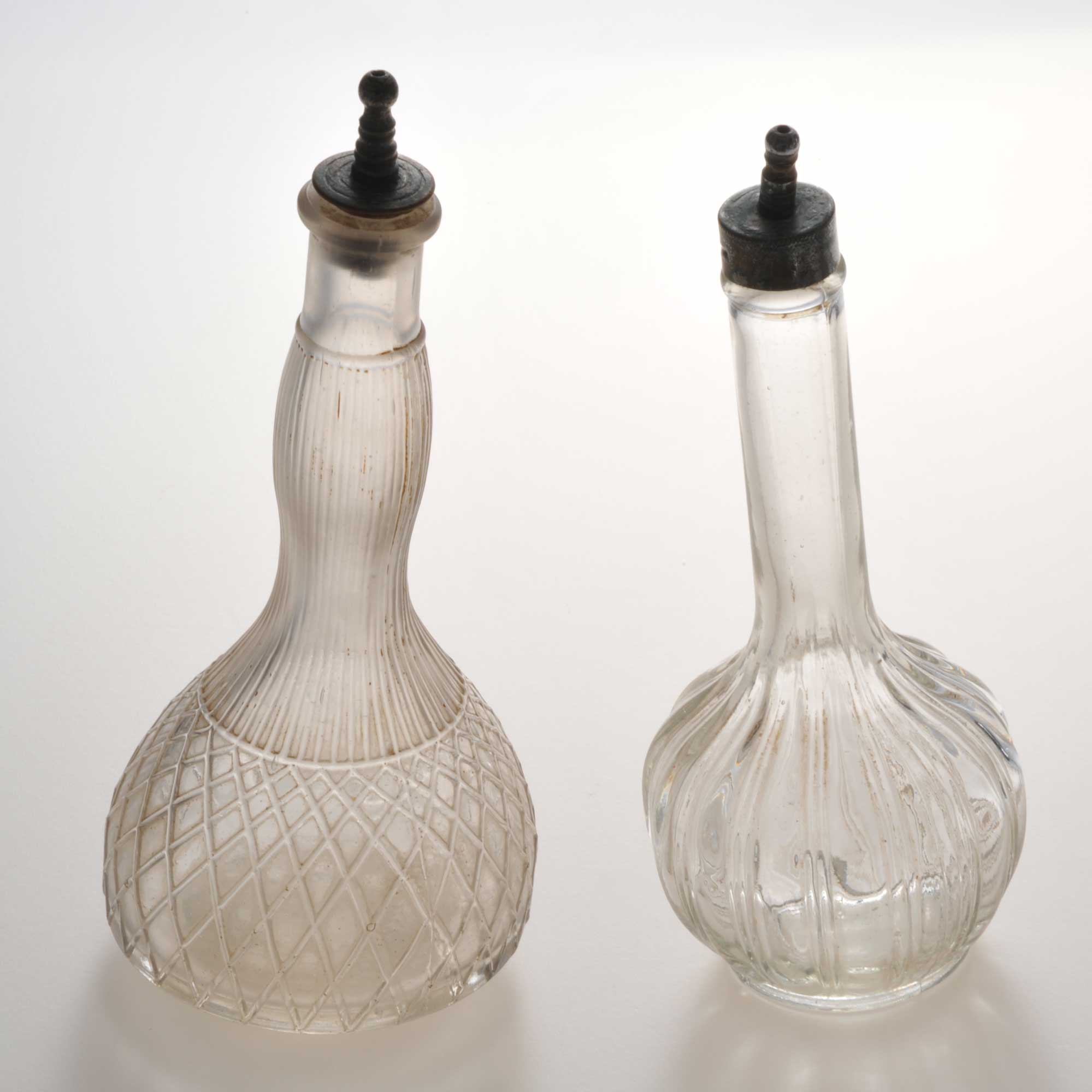 香水や調髪剤を振りかけるためのビン。オシャレなうえ手にフィットするように、表面に柄を施した。