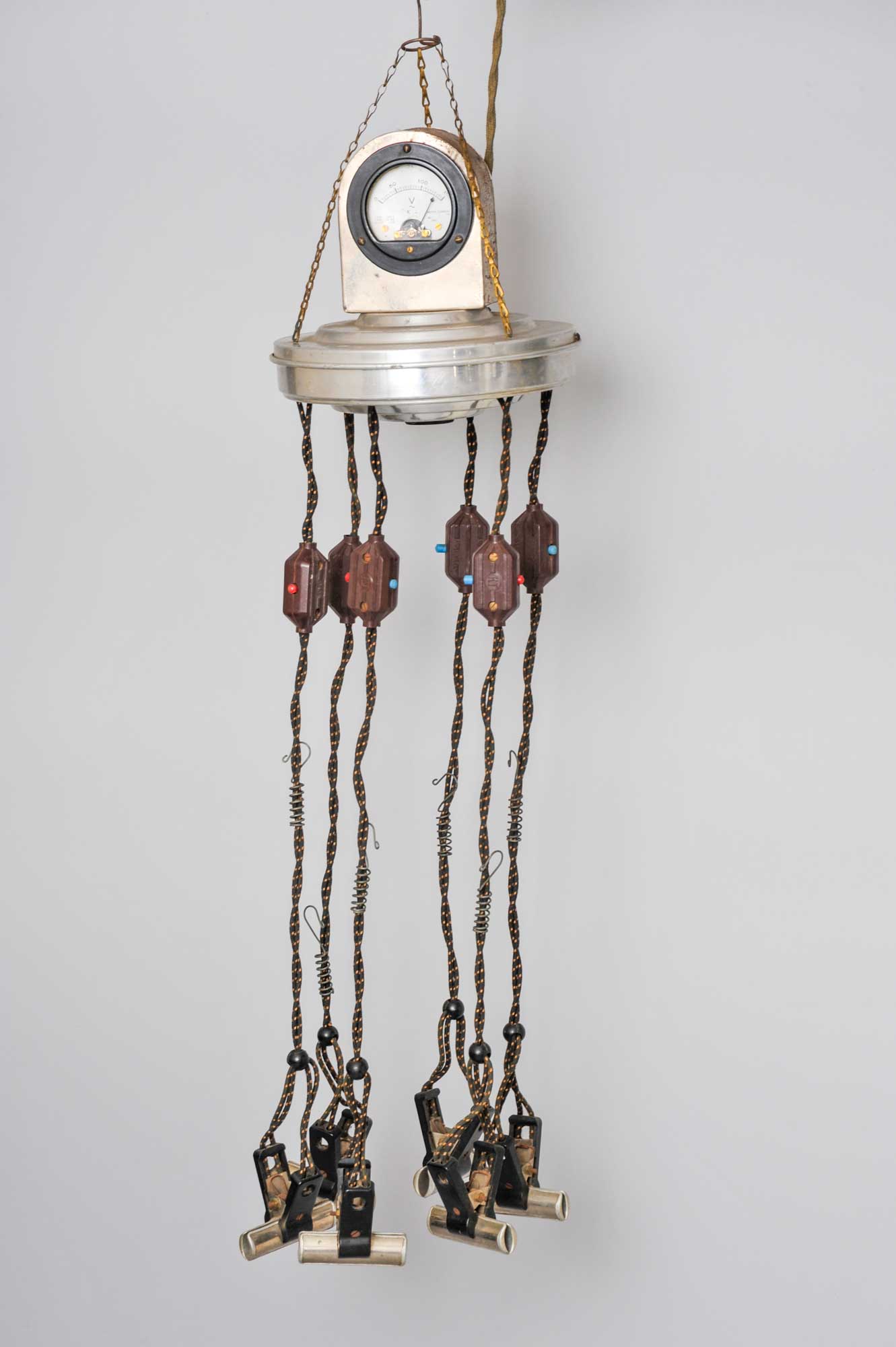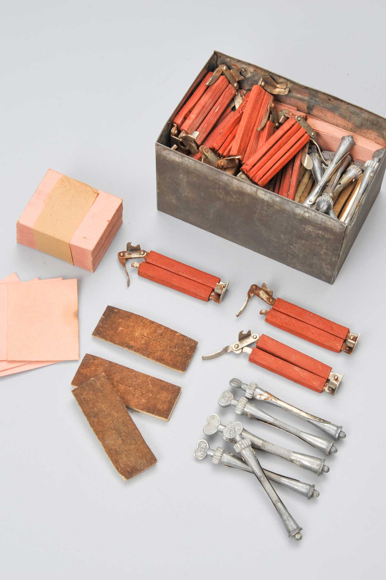 (写真1枚目)電発器:国産のパーマ器。ロッドに巻き込み、クリップのような部分にはさむと、電気の熱でパーマネントウェーブがかかる。初期のものは性能が悪く、かなり熱さを感じたと言う。